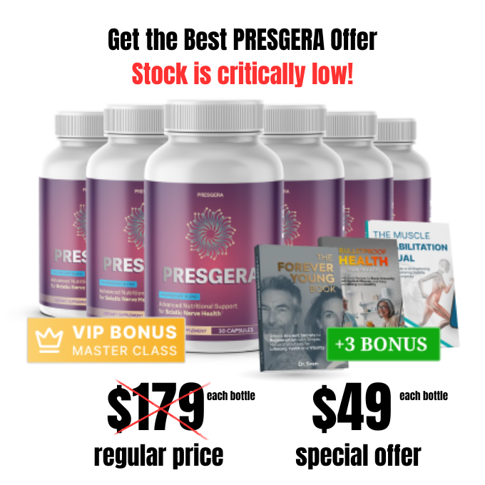 Take advantage of the incredible opportunity available today to order the Presgera supplement. With an astounding discount of 73% OFF and the added benefit of free shipping, this offer is simply irresistible. Act swiftly to secure your supply, as this limited-time promotion won`t be available for long. Plus, rest assured with our 60-day money-back guarantee, providing you with complete peace of mind. By making the wise choice to purchase now, you can save a remarkable $49 while experiencing the remarkable benefits of Presgera. Don`t miss out on this extraordinary chance to boost your well-being and save big! Click here to check if the discount is still available.
